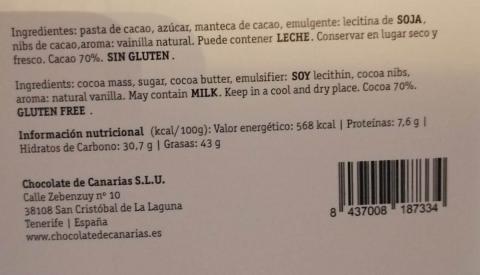 Tableta de Chocolate al 70% con Nibs de Cacao 100 gramos